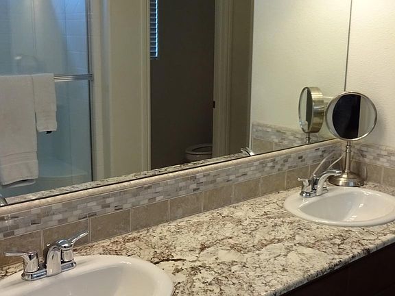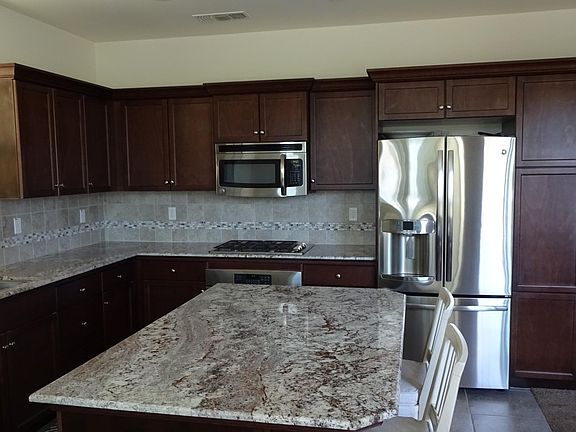 Charming single story 3 bedroom, 2 bath home with 1332 sq.ft. Open kitchen with center island can accommodate seating for 3 and offers lots of storage, granite counters and stainless steel appliances including gas stove, microwave and dishwasher. Master bedroom is secluded away from the guest bedrooms with en suite bathroom with dual vanities and walk-in closet. Washer/Dryer included and 2 car garage. Have access to all of the amenities Harlan Ranch has to offer! Many walking trails, various neighborhood parks, child jungle gyms and a large community pool with BBQ area.