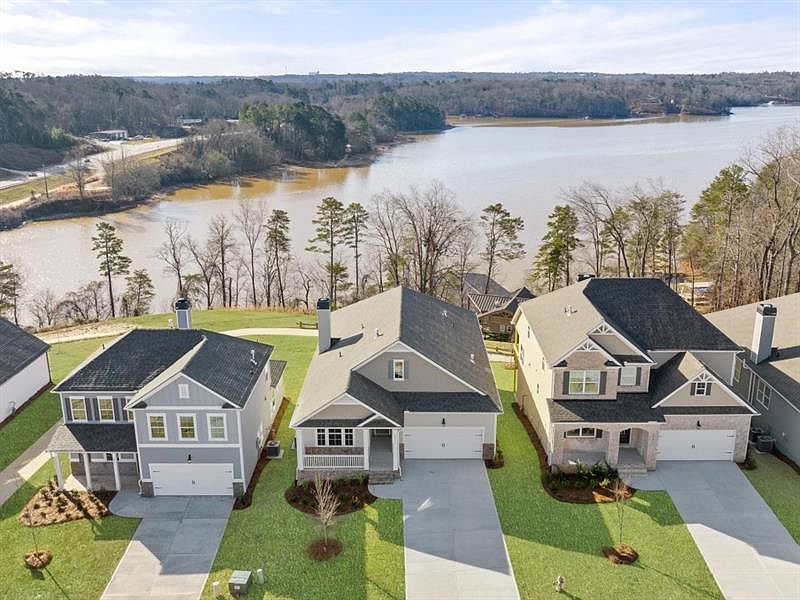 The Cottages of Lake Lanier is home to 3451 Big View Road, a charming home in Gainesville, GA. It's not often you find a picturesque home with equally picturesque views, but this Clifton delivers. This 2,911 square foot home offers a full bedroom and bathroom in addition to the primary suite on the main level and an additional bedroom and bathroom on the terrace level. As you enter through the cozy, covered front porch you'll find a guest bedroom and bathroom tucked away in the front corner of the home - a quiet retreat for guests. Continuing down the hallway you'll find a formal dining room with coffered ceilings and french doors which could alternately be utilized as an office. The kitchen is a chef's dream, with a statement island boasting a farmhouse sink, quartz countertops, and gray, shaker-style cabinets. The surrounding white cabinets, vent hood, and stainless steel appliances, which include a gas cooktop and built-in wall oven and microwave, complete the look. The generous great room is the perfect gathering space for friends and family and features a stacked-stone, wood-burning fireplace as a focal point. The back door opens onto a balcony with unimpeded views of Lake Lanier. Moving past the kitchen you'll find a laundry room that you won't mind spending time in, thanks to the gray upper cabinets, accent tile flooring, and a utility sink. The primary suite takes advantage of the vast lake views, showcasing them through a large picture window. The en-suite bathroom wows with bright tile floors, a white-cabinet vanity with double sinks, and a tiled shower. Two large walk-in closets round out the homeowner's private oasis. As you take the stairs down to the terrace level, you'll be welcomed into a sizeable game room that offers as much versatility as it does space. Off this room is an additional bedroom and bathroom and a door onto a covered back patio that has more of those sought-after lake views! Photos of actual home! Homeowners will enjoy access to the community's clubhouse, walking trails, and their own dedicated boat slip.