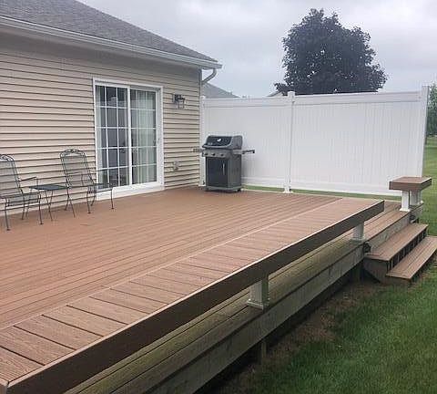 Nice 2 bedroom 2 bath home with open floor plan vaulted ceiling. The partial finished basement is pre-plumbed for additional bath and family room. Trex decking newer carpet and appliances.
