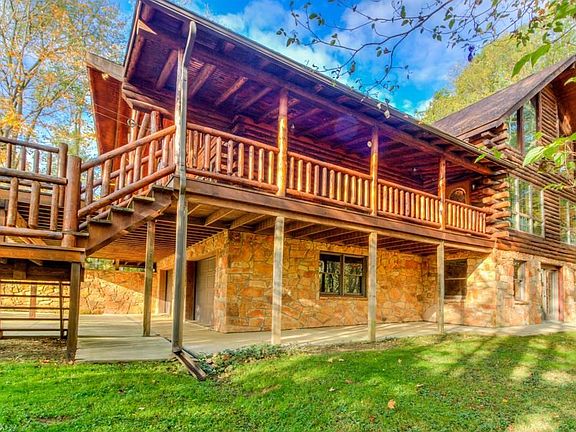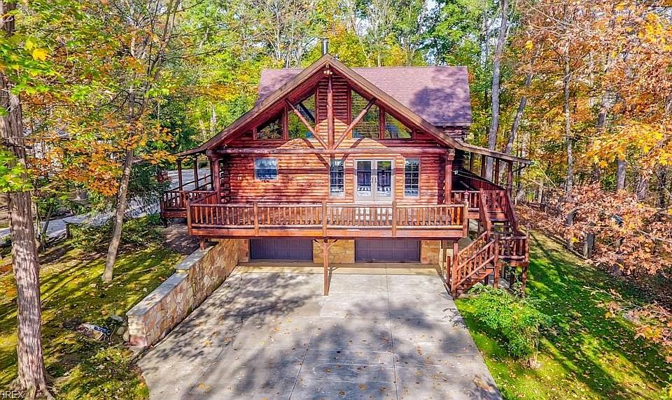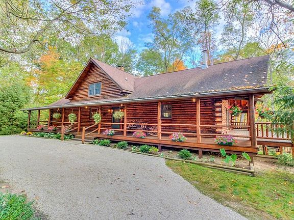 Beautiful & Superior built Log Home on wooded ravine lot overlooking the majestic rocky River on nearly 4 acres of scenic wooded land. Attached 2 car garage along with a Detached 60'x36 pole barn and workshop with wall heater & wood burning stove that will heat the whole house in the winter. Property sits on 3.785 acres on a beautiful wooded lot overlooking the Rocky River. Spectacular wrap around deck. Open floor plan with large kitchen. Family and dining area with wood burning stove, french doors open to outside deck overlooking the water. Living room features a beautiful stone fireplace First floor master bedroom with private walk-out balcony.Large main first floor with laundry room. Upstairs loft overlooking the living room and kitchen area Large Walk-out basement, and beautiful stone fireplace. French doors open to outdoor river view and outdoor patio. Beautiful private setting. Aerial video tour available, this is a must see!