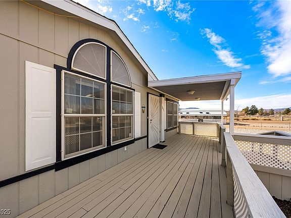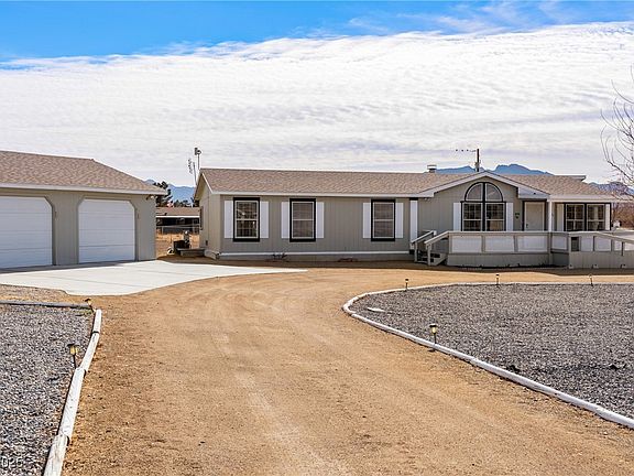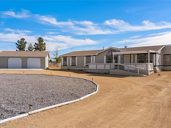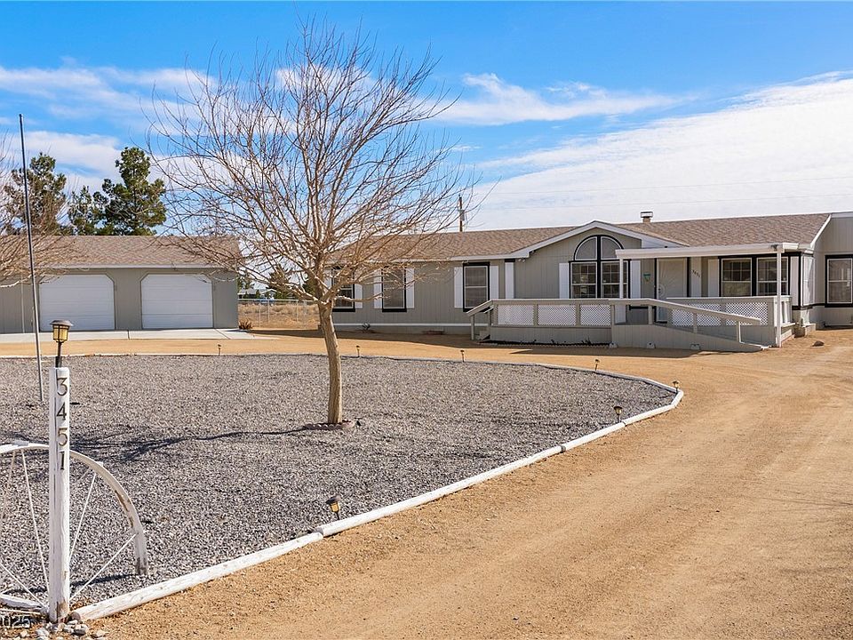 Charming 1,647 sq. ft. manufactured home on a spacious 0.92-acre lot with easy-care desert landscaping. This 3-bed, 2-bath gem features a formal dining room with a built-in hutch and a cozy living room centered around a wood-burning fireplace. The kitchen is a chef’s dream, boasting an island, stainless steel appliances, and abundant natural light from skylights. Stylish pot shelves add character, while upgraded wood-look ceramic tile flooring graces the main areas, with plush carpet in the bedrooms. The primary suite offers dual walk-in closets, a beautifully tiled soaking tub, dual vanities with upgraded faucets, and a separate shower. Step outside to enjoy the covered back patio overlooking your fully fenced backyard. An oversized 2-car detached garage, additional storage shed, private well, and septic complete the property. The well-maintained front yard with a circular driveway adds to the curb appeal, showcasing pride of ownership throughout this beautiful home.