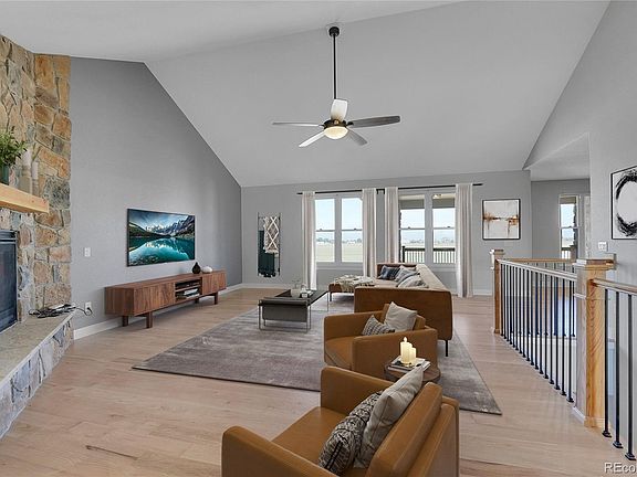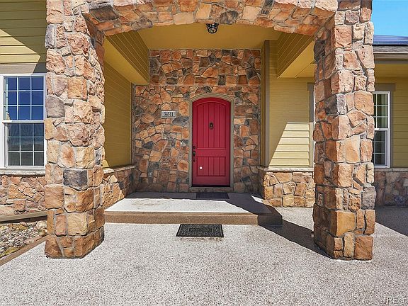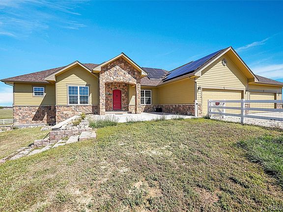 Welcome to this stunning ranch style home with breathtaking views from every window which is the essence of country style living. The heart of the home's open floor plan takes you seamlessly from the entry through the great room with it's massive gas log fireplace. At one end of the great room are the French doors to the deck, the other is the end is the formal dining area. The kitchen itself is a masterpiece with a massive granite island and seating for six. There is also space for additional dining. Cabinets galore for storage and a walk-in pantry. Off the entry enter the office or on down the hall to the private master bedroom wing, featuring coffered ceilings, five piece bath with a unique, charming footed tub and western views. Opposite side of the entry features two bedrooms with jack and jill bath as well as convenient laundry room with access to garage. Go downstairs to the vast lower level with a multipurpose room, second gas fireplace and guest bathroom. The French doors take you out to large patio. There are also another two bedrooms with jack and jill full bath. on the other side. The exterior of this sprawling ranch home, has extensive stone work accented by massive stone pillars. Lots of room to be creative adding your own landscaping to the two-plus acre lot or sit back enjoy the native grass. BUT WAIT... there's more---electric bills have been running between $15-35 a month (year around) with the complete SOLAR PANEL SYSTEM that is included in the sale price!!! The home is located the end of a quiet cul-de-sac- THIS CONVENIENT LOCATION gives you easy access to I-70. and from there west 25 minutes takes you to Anschutz Medical Plaza, 30 min Downtown Denver and/or DIA, 35 min to DTC, or Coors Field and 55 minutes to concerts at the famous. Red Rock Amphitheatre. CALL TODAY TO SEE THIS AMAZING HOME!!