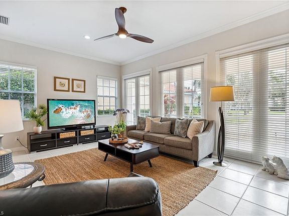 What a lovely home! This stunning residence offers an open floor plan perfectly designed for modern living and entertaining, featuring a formal living room with a wall of french doors that flood the space with natural light and provide picturesque views in the front of the home with breathtaking wide lake views and unforgettable sunsets in the rear. Recent updates include a new roof (2020), solar panels to heat the pool with energy efficiency (2020), and a new water heater (2023), along with a freshly painted exterior for a crisp, updated look, modern light fixtures and crown molding throughout. Inside, enjoy tile flooring throughout and wood in the bedrooms—no carpet anywhere and split bedrooms for maximum privacy for guests. The master suite boasts a his and hers master bathroom with a shared walk-in shower and a custom closet system for maximum organization. Step out onto the lanai and soak in the wide lake view from the newly resurfaced pool (2023) or find some shade under the retractable awning perfect for relaxing and when you want more shade. Hurricane shutters protect all windows and doors giving you peace of mind during storm season. Island Walk is a fantastic amenity-rich community complete with pickleball, tennis, lap pool, resort pool, restaurant, gas station, nail salon, car wash and more. The clubhouse will be undergoing a renovation with zero assessments!