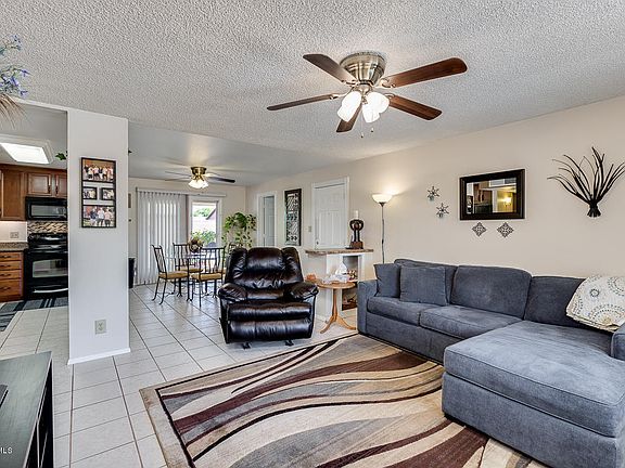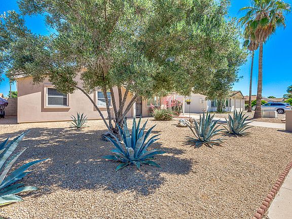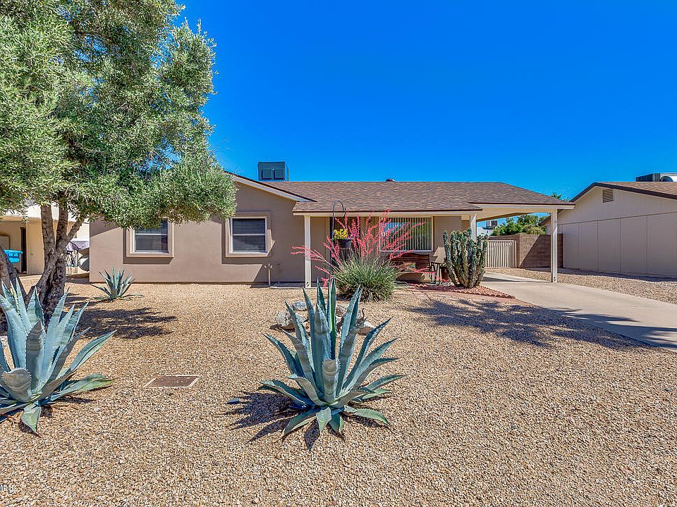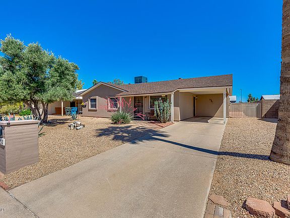Remodeled 3 bedroom, 2 bath in the subdivision of Paradise Valley Oasis. This adorable home has an open kitchen with newer appliances, Sile-stone countertops and beautiful cabinets with soft close drawers. The upgraded arcadia door leads to a huge private backyard with extended covered patio, brick pavers, grass area, fruit trees and 2 storage sheds for plenty of storage. The property also features a great room, tile flooring, carpet in bedrooms, ceiling fans throughout, huge laundry room with built in cabinets, dual pane windows, new roof, new AC, newer water heater, synthetic stucco and all under eves and post are newly vinyl wrapped. All of this plus a covered carport, RV gate with RV parking and no HOA fees.