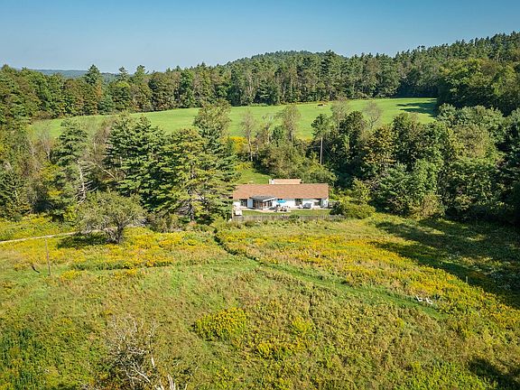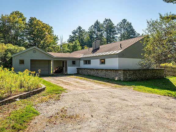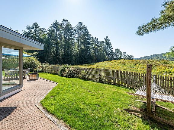 Sheltered by meadows with hillside views, nestled on a rise off scenic Route 100 is a one-level 3 bedroom 2 full bath contemporary on a 3.17 acres oasis of privacy. The floor plan is delightfully efficient. Sliders onto a long brick patio, fenced garden lawn and views are design features throughout. A mudroom room opens to a foyer hallway. To the right is the open living dining area with an impressive windowed prow. Continuing off the living area is the primary bedroom en suite with renovated full bath and mirrored closet doors. Left of the foyer hallway is a second renovated full bath and the family room with a wall of storage closets. Two guest bedrooms, one currently used as a lounging TV room, complete the end of this wing. A surprisingly roomy updated galley kitchen with convenient washer dryer nook provides access between the wings on the southern side. A covered porch connects the mudroom to an oversized one car garage with overhead storage. The meadow beyond is crisscrossed with mown paths and the opportunity to see occasional wildlife. The current owners have been diligent in updating systems, repairing, maintaining the property as needed. Offered partially furnished to start and make it your own. Venture out from your private world at 3452 with Stratton, Bromley and Magic a short drive, plus a myriad of other outdoor activities, shopping and dining, theatre, music and galleries in neighboring village and towns, and discover life in Vermont is full of pleasures.