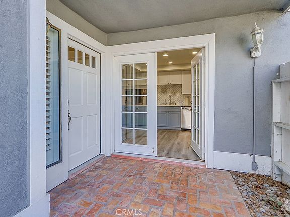 Upon entering, you're greeted by an enclosed brick courtyard leading to a remodeled kitchen featuring all-new cabinets, tile backsplash, and recessed lighting. The ground floor also has a bedroom with vaulted ceilings and barn door closet doors, alongside a full bathroom and laundry area complete with appliances.