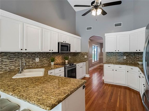 - Interior Features: Cathedral Ceiling(s), Ceiling Fans(s), High Ceiling(s), Master Bedroom Downstairs, Split Bedroom, Walk-In Closet(s), Unfurnished, Solid Wood Cabinets, Eating Space In Kitchen, Stone Counters, Thermostat