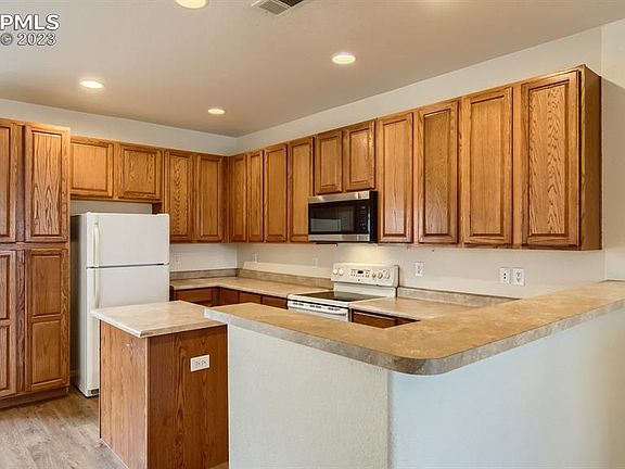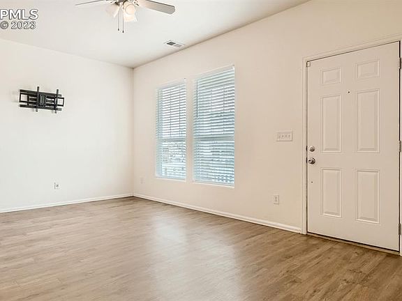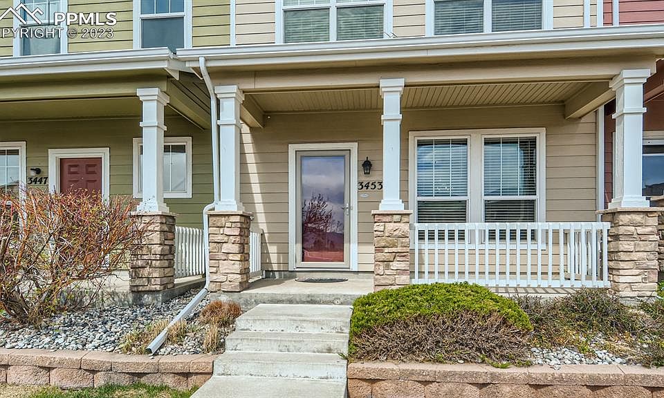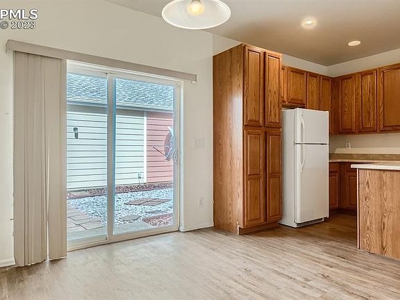 Centrally located, 3 bed, 2 1/2 bath townhome, includes a spacious detached 2 car garage. Downstairs has an open floor plan, featuring newer vinyl flooring, a gas fireplace, 1/2 bath, and an island in the kitchen, all great for entertaining! Upstairs has brand **NEW carpeting** Primary bedroom has a large walk in closet and bathroom. Upstairs laundry room, two spacious bedrooms, and second full bath. Beautiful views of Pikes Peak and parks!
