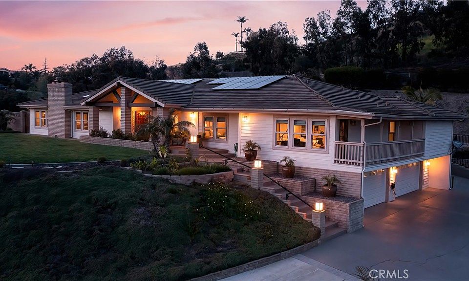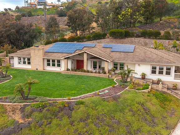 Welcome to 3453 Los Sicomoros Lane in the charming community of Fallbrook. A custom ranch, this 4225 square foot home, sits on 1.47 private gated acres, has 4 bedrooms and 4 bathrooms which includes 2 master suites located at opposite ends of the home. Both have on suite bathrooms, his and her large walk in closets and exterior entrances. The two additional generous bedrooms feature large closets with mirrored doors and multiple windows that face the gorgeous views. One bedroom, currently being used as an office, has built in cabinetry, an oversized closet with light and an exterior door that leads to a balcony. The kitchen is at the center of this home and features new aged ornate tile, antique hardware, granite countertops and stainless steel appliances which include, a gas 5 burner cooktop and a double oven. You will love the large amount of cabinet space this kitchen offers, with pullouts in all the lower cabinets and soft close drawers throughout. The dining room, easily seats eight, has double french doors leading to the back patio, a large chandelier with blown marbled glass shades. The front sitting room has a bay window with seating to take in the view. An oversized living room provides multiple view windows as well as a large fireplace with custom doors. This room includes a bar and is large enough to accommodate multiple seating areas. The home has wood flooring throughout all the main living areas, tiled bathroom floors and carpet in the bedrooms. Custom stained glass designed by the original owners wife can be found in the west end master bathroom and at the entry of the home on either side of the double front doors. An oversized front porch and back patio ensure that you will spend your time taking in the gorgeous views and enjoying the beauty that can only be found in Fallbrook. This home has newer water heaters, 2 newer furnaces with hypoallergenic electronic air filtering systems and a newer 5 ton air conditioner. Solar is owned and was purchased in 2020. The 4 car garage has epoxy flooring, built in storage, a fan cooling system, a utility closet and a permitted 240v ev charging station. The basement is finished and is accessible via the garage and offers 525 square feet of bonus space.