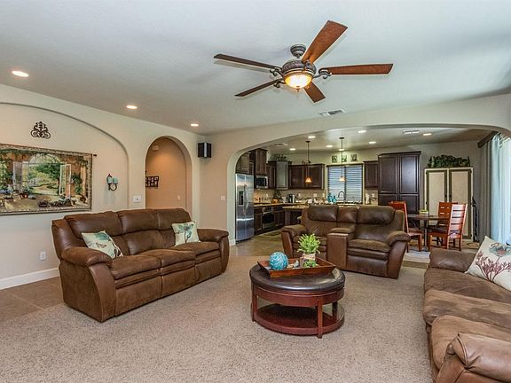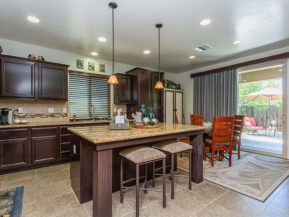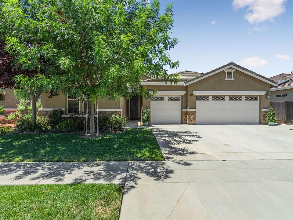 Wow! Single story Woodside blt 4BR 2.25BA w/3 car garage in Clovis Unified. Fantastic floor plan with huge great room open to kitchen. Enjoy fabulous amenities as granite kitchen counters, snack bar, stainless steel sink, gas stove, 18 inch tile floors in traffic areas, tankless water heater, and Tuskin look with dark cabinets. Wonderful improvements in nicely landscaped front and backyards and added cement walkways on both sides of home. Note mature trees, covered patio plus extended patio slab and canopies for windows in great room. Seller has enclosed original FDR and made it into a den. The 4th BR is used as an office and does not have a closet. Master BR is large and isolated with large walk in closet. Master BA features tub and separate shower plus dual sinks.