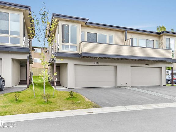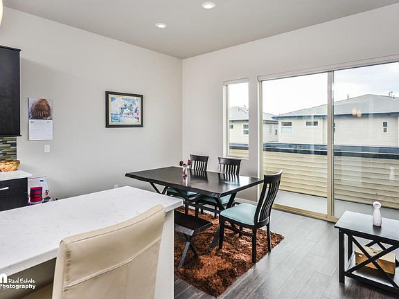 Gorgeous contemporary townhouse in South Anchorage! South facing floor to ceiling windows with tons of natural light! Open layout with 10 foot ceilings and large gourmet kitchen with quartz countertops, breakfast bar, tile backsplash, stainless steel appliances, and walk in pantry. Large master bedroom with walk in closet and on-suite bathroom featuring (See more info) double vanity, tile flooring, and rain maker shower head. Deck off dining area, gas fireplace, laminate flooring, recessed lighting, motorized blinds, plus washer and dryer included. Heated and freshly painted 3 car garage, and community garden! Dues include exterior maintenance, grounds maintenance, insurance, refuse, sewer, water, and snow removal of driveway and sidewalks. This is a must see!!