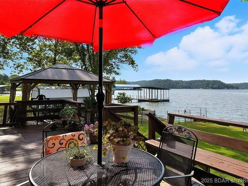 This lakefront home offers it all—flat lot, just a few steps to the water, and expansive Lake of the Ozarks views. Enjoy peace and privacy with no close neighbors, plus a newly built covered gazebo over deck with seasonal screen inserts for year-round comfort. Inside this single level home are 3 bedrooms, 2 full baths, and newer everything: kitchen cabinets, countertops, stove, windows, furnace/AC, hot water heater, laminate flooring, carpet, extra-large walk-in showers, vanities, toilets, smoke detectors, and a Zosi security system. Roof with IKO shingles installed 2020. The beach-like entry with sand are perfect for kids, while the 1200 sf insulated crawl space, storage shed, and fish-cleaning station add convenience. Private two-well dock and neighboring boat ramp make water access easy, and the bonus guest cabin/bunkhouse offers a cozy getaway for visitors—perfect for hosting friends and family, your private office or Fitness Room. Sold fully furnished and turn-key, it's ready for you to start enjoying lake life today—whether as a full-time home or Lake home vacation retreat.