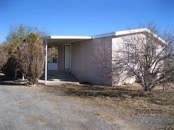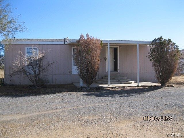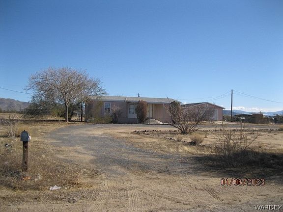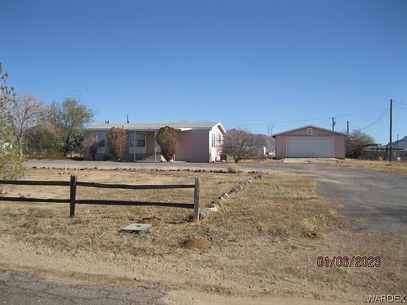 Located on paved road in Golden Valley is this freshly updated three bedroom, two bath home. New flooring and paint through the inside. 1.17 of an acre where horses and livestock are allowed. Plenty of room for gardening, parking your RV or "toys", etc. Back portion of property is fenced. Nice garage could fit up to two vehicles, depending on size. Large U shaped driveway allows for plenty of parking space. Panoramic views of Golden Valley and located just of Hwy 68. By the permits I obtained, this double wide manufactured home was built in 1989 and looks to have been moved to the property in 2001. Terms are cash.