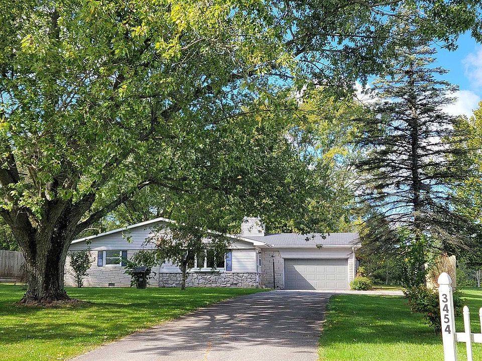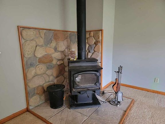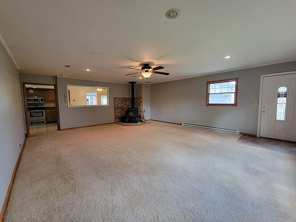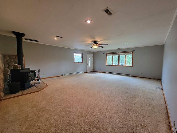 County home, nice yard sits on .77 acres. Lots of space, wonderful living room which is so spacious with wood burning stove, 3 bedrooms, wonderful eat in kitchen with breakfast bar, lots of cabinets, some appliances, finished basement with family room, fireplace & mechanical room with a huge shower and storage room. Doors from the dining room, lead to a 28 x 14 Covered Patio which sits beside a deck, yard has chain length fenced around an area for our furry friends or children. Home has a 2 car attached garage, and a 36 x 26 dt garage . Yard extends behind the dt. garage. Home has a low maintenance exterior.