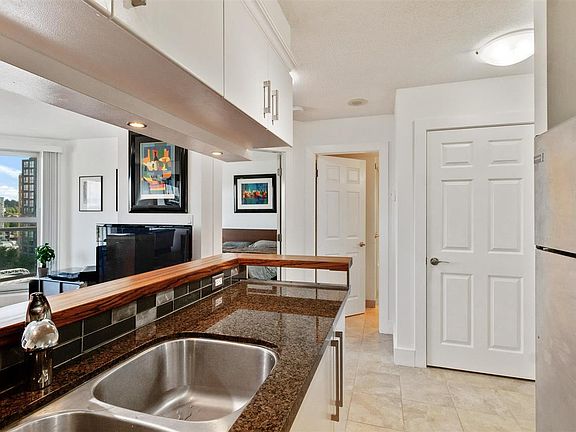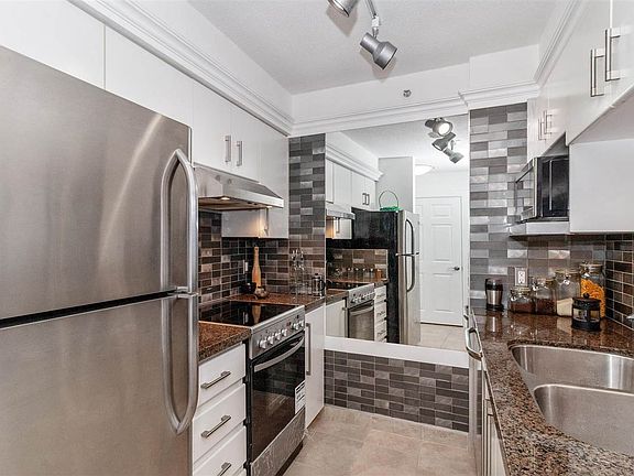 First time buyer & investor alert !!! JUST MOVE IN !! clean, bright, updated open layout 1 BRM with east facing partial mtn n city view, NEW entrance tile, NEW soaker tub n granite counters in bath, sleek open kitchen with NEW tiles, NEW granite counters, stainless appliances, exotic 'zebrawood' eating bar, nice 11x 6 balcony, 1 parking, "QUEENS COURT" Prime Collingwood location steps to Joyce station, bus loop , restaurants, shopping n markets. DON'T MISS THIS ONE !! showings by appt only