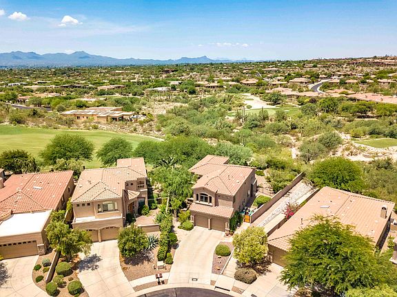 Prime location within the Villages of La Paloma. Cul-de-sac lot offers city, mountain and La Paloma golf course views. Custom features include 24'' natural stone flooring throughout except for the bedrooms, 8' solid core doors, Granite slab counters & backsplash in the kitchen, a Cantera stone gas fireplace in the living room, upgraded light fixtures, bathroom faucets & sinks, 42''Cherry cabinets with crown molding & custom window coverings. Soft water system, oversized two garage with cabinets & area for tools. Private backyard sits high above the golf course & has a covered patio, flagstone, fountain, outdoor kitchen, two side yards (one for a dog run and the other has a playset, both have grass). Move-in ready home that has been meticulously maintained & is a pleasure to show.