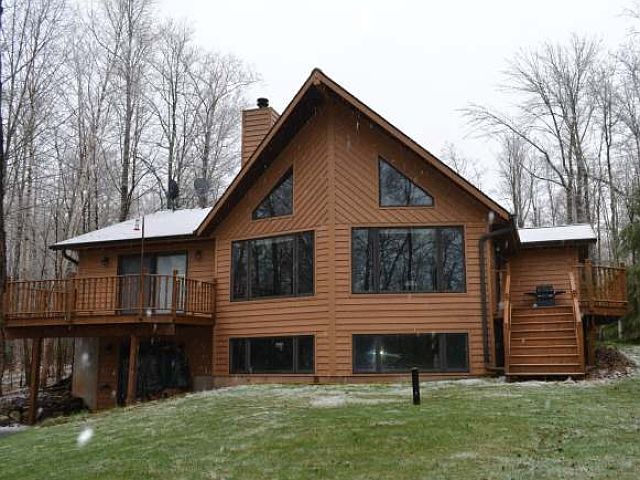 This gorgeous custom-built 3 BR, 3 BA home sits on over 2 acres of private wooded land and has 100' of frontage on beautiful Lake Lucerne. Have your morning coffee on the front deck that is entered through the patio doors from the dining room, or listen to the loons on the large back deck with double patio doors entering from the living room that has tongue-and-groove cathedral ceilings with large beams, a free-standing wood stove, and a spacious loft area. The kitchen has oak cabinets, large pantry, and snack bar. You will love the large master bedroom with patio doors, private deck, walk-in closet, and adjoining bath. An additional bedroom and bath complete the main level. The lower level has walk-out french doors, storage/work area, and 1/2 bath that is plumbed for a shower. A 30x36 garage with an attic storage area and a large 30x50 pole building are available for all your toys. Enjoy the firepit, wildlife, fishing, boating, and endless possiblities! Priced well below appraisal!