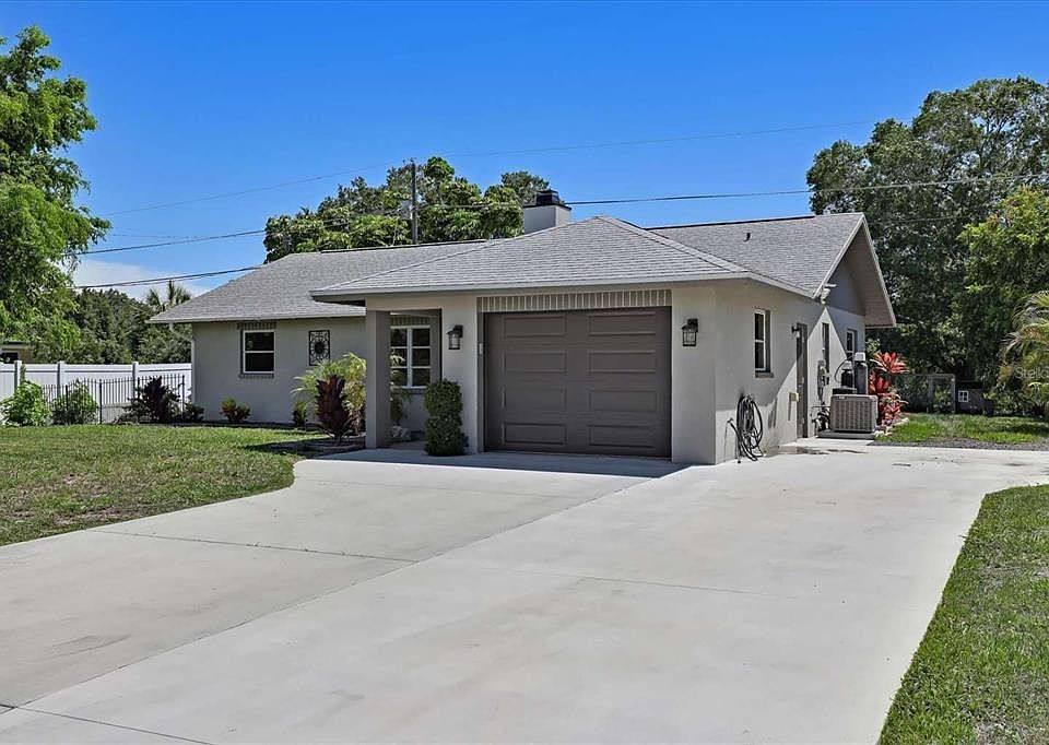 Modern & Move-in Ready NO FLOOD ZONE, NO HOA, NO CDD = AFFORDABLE LIVING in this charming updated 2-bedroom, 2-bath home, 1-car Garage (oversized) that offers a split floor plan with soaring VAULTED CEILINGS, making it feel open and spacious. French doors lead to an OVERSIZED LANAI, perfect for relaxing while overlooking the private backyard with no rear neighbors. Open floor plan, LARGE LANAI & PATIO plus OVERSIZED PARKING allows for easy entertaining. Enjoy peace of mind with recent upgrades including HURRICANE-IMPACT WINDOWS and GARAGE DOOR, GENERATOR HOOK-UP, a whole-house RE-PIPE, luxury vinyl plank flooring, and stylishly updated kitchen and baths. Plus Newer ROOF and HVAC. Nestled in a prime location just minutes from Gulf beaches and historic downtown Venice in a friendly neighborhood with access to a boat launch and ferry to a private beach for neighborhood residents (optional for a small fee). Owner is a licensed Real Estate agent