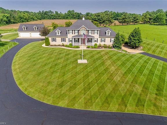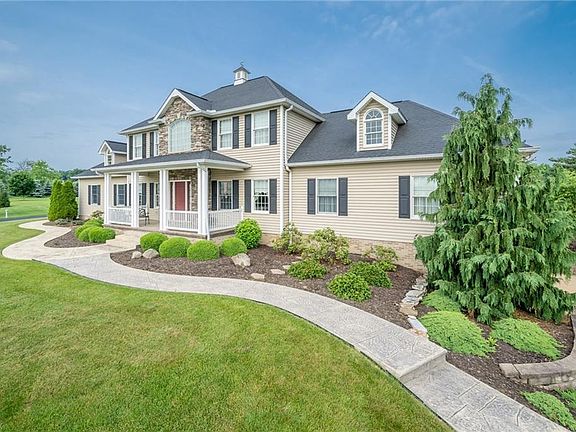 Stunning custom home built in 2007 with all the right features. The home sits on the hill overlooking the 1.3 acre pond which is fully stocked. This well maintained home features First floor Master Suite with large walk-in closet. Master bath offers shower, double vanity and jetted tub. First floor laundry is ready to go with w/d included. Large, open eat-in kitchen with beautiful custom built cherry cabinets which opens to formal dining room. French doors open into the office finished with cherry flooring. Spacious living room with gas fireplace completes the main floor. 3 large bedrooms upstairs, each equipped with walk-in closets. Jack-n-Jill bath with double vanity. Bonus room overlooks the front of the house and pond. The lower level is equipped with heated floors throughout and a full kitchen, theater room and large recreation room that walks out onto lower patio. There is an attached 2 car garage with heated floor, water, and utility sink. The detached 4 car garage is equipped with heated floor and a gas furnace to allow year round projects, making this a perfect place for the auto or sports enthusiast. The shed measures 12 x 30 and is suited for storage of lawn or garden equipment. Home equipped with generator to service entire household. Central boiler wood furnace installed in 2008 as alternate heat source. 4.25 acres of tillable land for farming, gardening or pasture. New A/C in 2017.