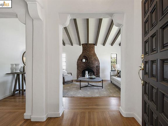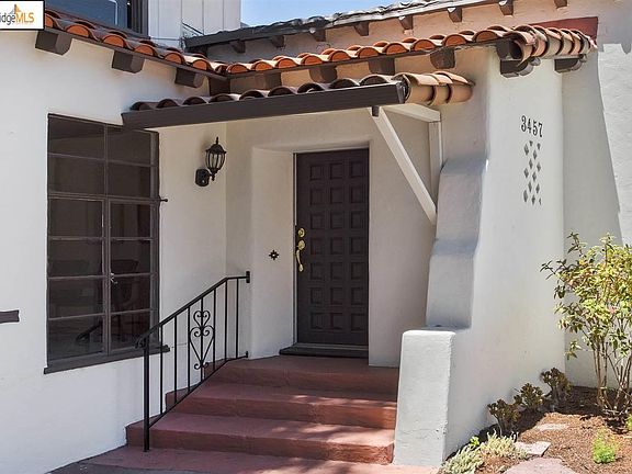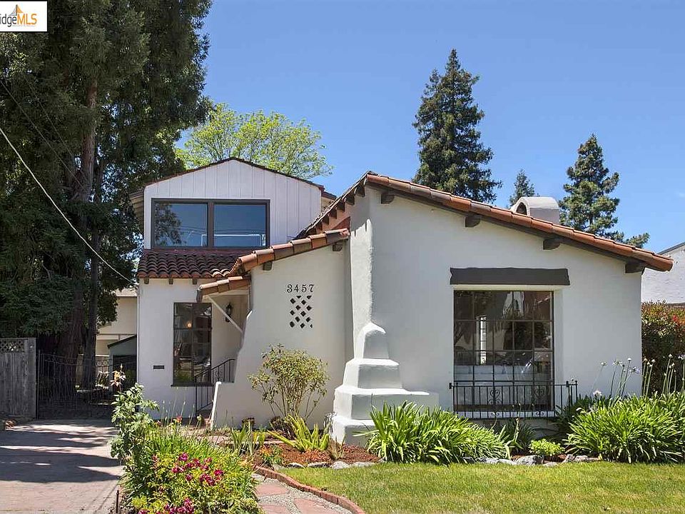 Dreamy Spanish Mediterranean on Redwood Height's cozy "Lane in Spain." Improved once-upon-a-time to include a master suite and deck upstairs, this home features original detail rich in charm. Arched openings, steel-framed windows and classic metalwork set the stage. A unique brick fireplace is the rustic centerpiece in the living room. Multi-pane windows look out to the newly landscaped front yard. The formal dining room sits astride the eat-in kitchen, host to all-new appliances. On the main level and a split-level above are two bedrooms and a bathroom. A split-level below the kitchen and with a view to the back garden is a bonus room, fine as guest room or office. The lot is extra wide, with a big grassy area under shade trees along the left. The driveway runs alongside to a garage set at the rear of the property. At the back is a large, leafy brick patio with stucco accents. A fine neighborhood, just blocks to schools, a quick zip to Laurel & Dimond, and so easy to 580 and 13.