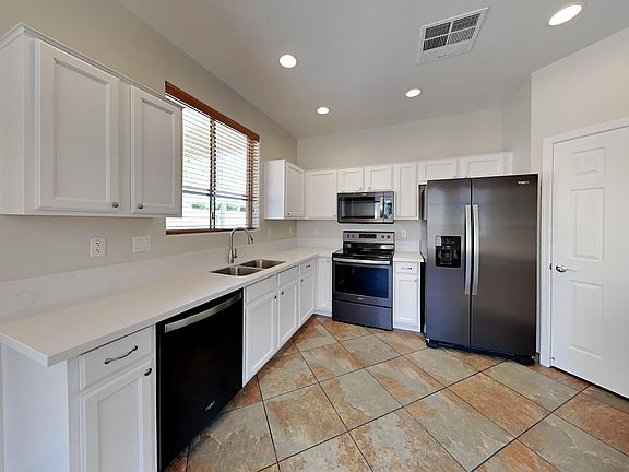 Cozy single story 3 bedroom 2 bath home located in the Manors at Red Mountain Subdivision. Great location close to schools, shopping, and dining. Guest bedroom and bath up front off entry. Primary split to rear and has dual sinks and dual closets. Large windows in living room almost ceiling to floor. Kitchen features quartz countertops, bright cabinets, and black stainless steel appliances with fridge included. Backyard features covered patio. Don't miss this one!