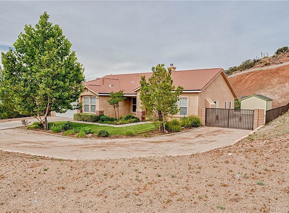 Lovely and functional home that is single story with large layout for a good sized family. There are 4 bedrooms and an office or library off the living room. The Kitchen is very well laid out, with lots of counter space and an island for meal prep. Nice cabinets and sunny room with direct access to the backyard patio. The Master bedroom is very large with a "retreat style" bath with a tub and separate shower and double sinks. A fireplace is in the living room ( not wood burning) and there is a "Santa Fe" styled fireplace in the back yard with artificial turf and a large covered patio for summer living. The side yard has RV access and DG to complete the neatness of the yards. Nicely landscaped and has been maintained by a gardener the entire time owner has owned the house. Tile roof and fantastic views from the front and in the back yard affording privacy. Affordable price in this market for what you are paying elsewhere with a lot more for your money. Lot size is 1.94 acres! SEE REMARKS FOR MORE DETAILS!!!