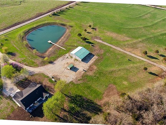 Beautiful 16 acre tract, partially wooded, with small lake and new ranch home!! Patios on both front and back of home allow views at all times of the day. The fun, the peace, the views, the possibilities are limitless!!!! Swim or fish in the lake. Hunt in the trees, a few animals or hay on the flat...so many options for your imagination and desire. The home is built on slab with a small basement/storm shelter that can be accessed through the main bedroom floor. Well water coming into the house has a purification and softening system. Huge pantry! 40x60 shed could use some work for your own designation or makes great storage shelter as is. Just the right amount of land for privacy and fun!!! Come make this your home.