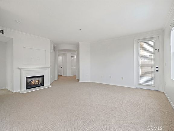 The spacious living room is accented with elegant crown molding and is centered around an inviting fireplace. For added convenience, the unit includes private interior laundry and three assigned parking spaces.