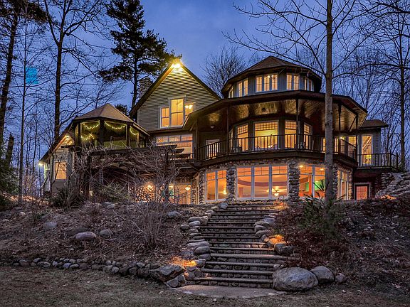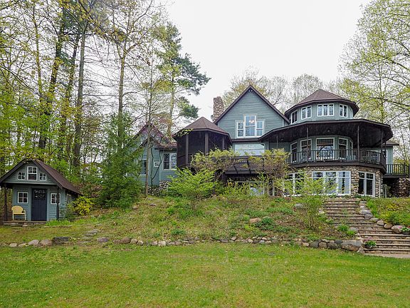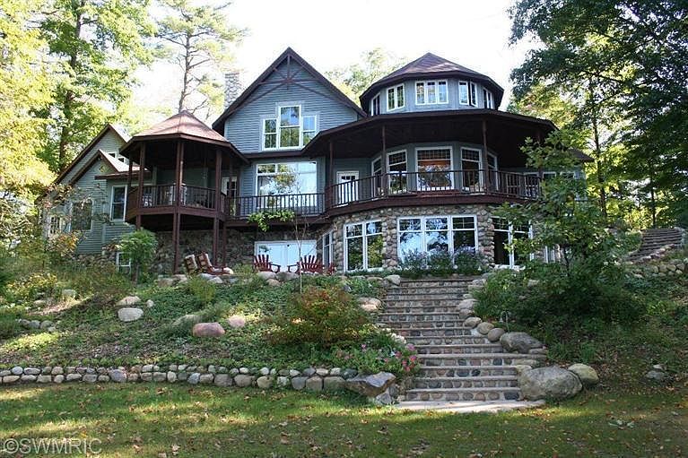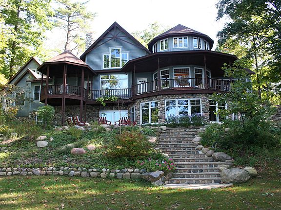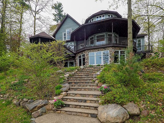 Stunning custom built home on 10+/- private wooded acres w/200' of sandy beachfront on Sweet Lake. This home is great for entertaining family & friends. Is bed & breakfast or wedding venue a dream of yours? The possibilities are endless. Built w/walls of windows & panoramic views of the lake from most rooms. Featuring over 5,700 sqft, 6 beds, 4 baths, beautiful woodwork from trees off the property, wraparound covered porches, screened gazebo, field stone accents & custom features. The kitchen has plenty of cabinets & counter space, snack bar, large dining area & cozy sun room. Great room w/24' high cathedral ceiling & stone fireplace. Main floor master suite w/private bath & walk-in closet, MFLaundry, 4 bedrooms on the 2nd level, 2 w/lofts. The walkout level has finished family & rec room,