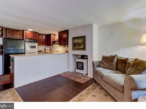 Rare opportunity to own this storybook home with more than 2 centuries of history. This charming Trinity style home, built in 1798, retains much of its original character and is a hidden gem. Upon entering, you'll be greeted with a cozy kitchen/sitting area featuring original random width oak flooring and wood burning fireplace w/insert. The efficient galley style Kitchen area features wood cabinetry with solid surface countertops. A partial bath completes the main level. A gently curved staircase leads to the generously sized Great Room on the 2nd level. Bright and cheerful, with front and back facing windows; the Great Room features original random width oak flooring, built-in storage closets, wood stove, and access to the inviting fenced backyard w/spacious brick patio. This level is sure to be everyone’s favorite gathering place. The Bedroom Suite, located on the 3rd level, offers random width oak flooring, vaulted ceilings, skylights, exposed stone wall, a 5’x5’ dressing area with built-ins, and a full bath. Trinity style housing was popularized in the Philadelphia area in the 18th and 19th centuries. Few examples exist today, and the style is experiencing renewed focus by those interested in the tiny-home movement. In addition, this unique home is located in Media Boro, “Everybody’s Hometown”, and is just footsteps away from fine dining, retail shops, Trader Joe’s, public transportation, and all the fine community events offered in Media Boro.
