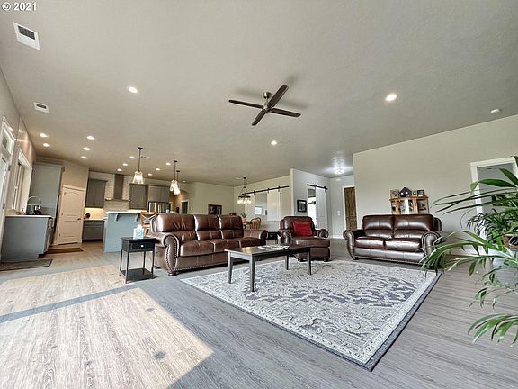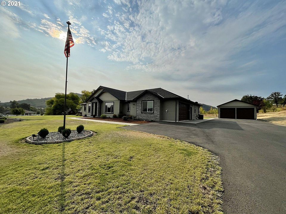 Drive into this gated community with tree-lined entry & fall in love with this one-level home! High ceilings throughout, huge great room floorplan, media room that opens to the great room with barn-door windows, & a split floorplan too. LVT flooring and quartz countertops throughout. Large master suite with soaktub, tile shower & walk-in closet! Enjoy the large level yard, covered private patio, enclosed garden & fruit trees! 36x24 insulated shop! Family friendly or a luxury retirement.