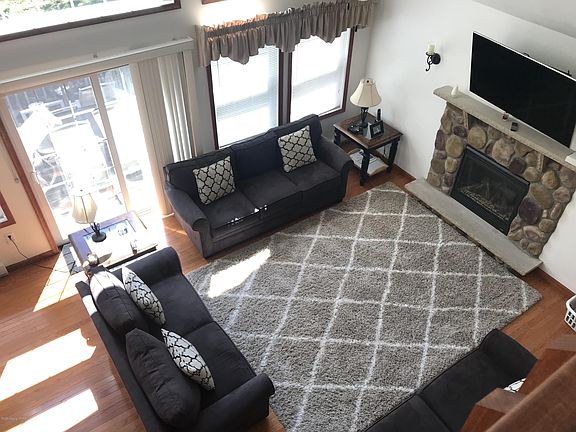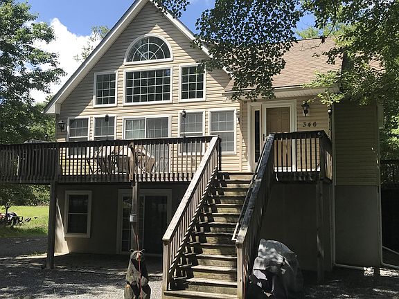 Move Right in! TURN KEY Oversized Mountain Chalet! Close to Lake. Would make a great VACATION RENTAL! VERY SPACIOUS, offers 4 Bedrooms, 3 full baths, Huge Family/Game room, MASTER EN-SUITE w/balcony overlooks wooded back yard. Modern Kitchen, CENTRAL AIR, HARDWOOD FLOORS highlight the living and dining rooms. Soaring cathedral ceiling w/full glass windows for tons of NATURAL LIGHT! Large Front and Rear decks for outdoor entertaining. Whole house water filtration. Extra Large Storage Shed for all the outdoor toys. Community has a nice lake stocked seasonal, fishing club, nice beach, community center and playground area, PAVED ROADS. ATV's allowed. 5 MIN to Big Boulder Ski Area, & Entertainment/Dining options of Lake Harmony & Split Rock! SEE INVENTORY OF ALL THE EXTRAS INCLUDED
