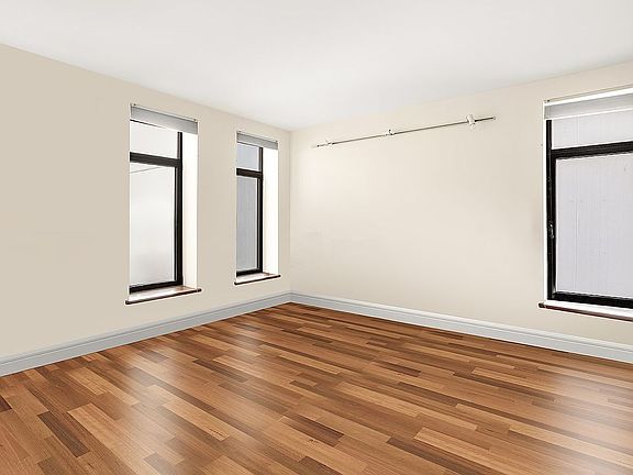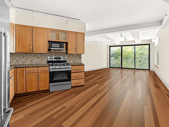 In the corner owner's suite, you'll find king-size proportions, a walk-in closet and an en suite marble bathroom with a soaking tub/shower and wide console vanity. Two spacious secondary bedrooms boast roomy closets, while an in-unit washer-dryer and central air conditioning add comfort and convenience to this lovely Brooklyn condominium.