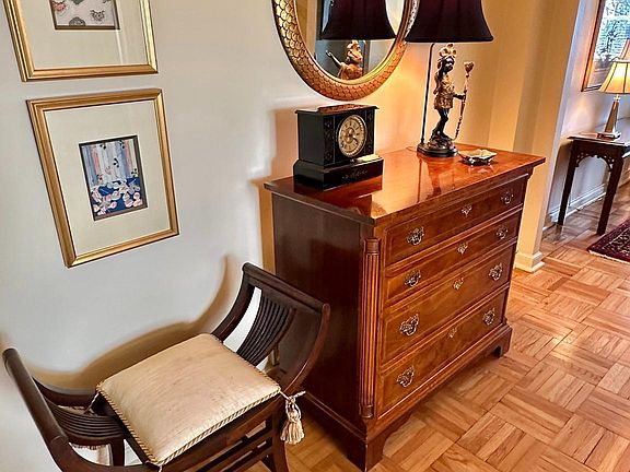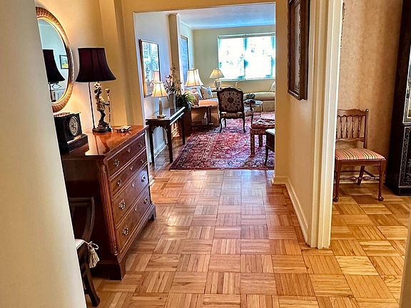 Wynnewood Plaza Condominium is a gem of a location and this large (1305 sq ft) 2-bedroom, 2 bath condo is on 5th floor with no one above you! The gorgeous original parquet floors are utterly charming. Entry to condo is an open foyer with a double closet custom built by owners. The kitchen is a handsome one, an updated galley with light cabinets, countertops and cool lighting. It is well equipped and has efficient working space. The dining room feels like it belongs in a house, it is so spacious with big windows. Continuing down the foyer, the condo opens to a large living room facing south. Windows go across the entire width of the room, with several seating areas. From the living room there is a hall with a large storage closet, 2 bedrooms and a full bath. The hall bathroom is bright and has a tub. The stacked washer and dryer are in closet in hall bathroom. The primary bedroom is a corner location facing south and west with views of trees and grass. Windows have two exposures, again, plenty of light in this room. The adjacent master bath has a stall shower. In the second bedroom, you will find another corner room with windows on two sides. There is a large closet, as well. In the lower level of the building are the storage areas for each condo, fitness room and a most impressive social/meeting room with library. This condo faces Wynnewood Rd, not Lancaster Avenue. This location has so many pluses: it is .3 of a mile to Wynnewood train station, it is directly across from Whole Foods which is both a grocery store and a restaurant with delicious goodies always. Wynnewood Shopping Center across from the train station has numerous restaurants and shops. To get to Narberth and its shops and parks, just walk under the train overpass. This is a beautiful area with plenty of lush landscaping, elegant homes with interesting architecture. The condo fee includes everything except for electric, phone and cable. There is a parking garage under the building, rental spots ($60) are available based on waiting list. The move in fee is $250, the capital contribution is $1404.26 currently.