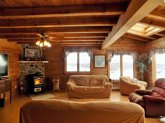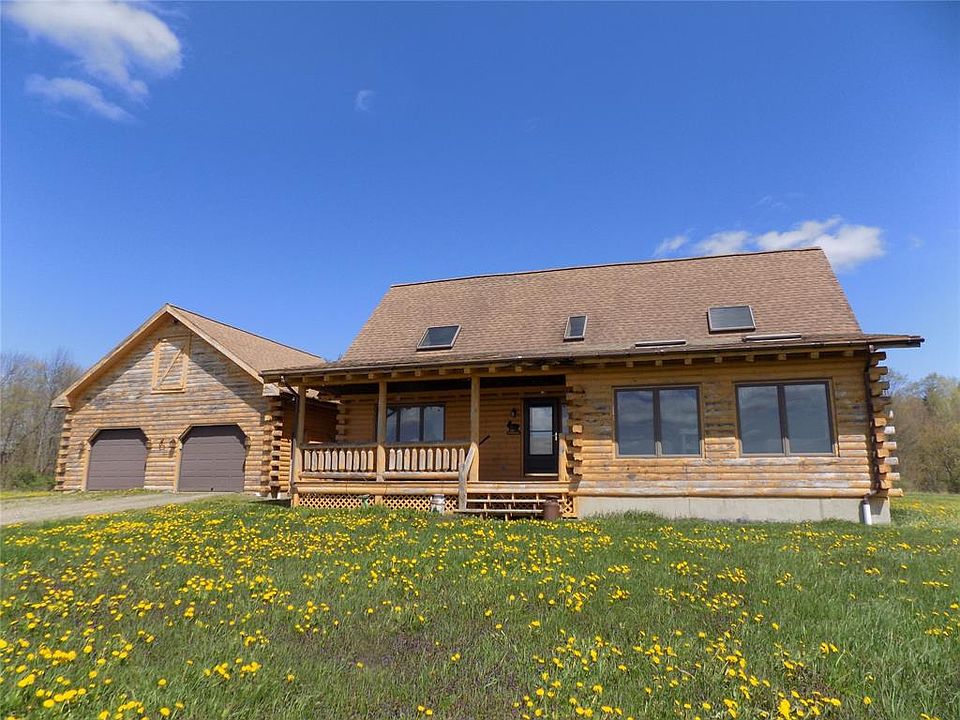 Views, Views, Views, this home has them for miles! This 4 bedroom 3 bath log home is very spacious and sits on 9.58 Acres! Enjoy the view from the beautiful covered front porch! It has a large eat-in-kitchen w/a stone covered breakfast bar and French doors that lead to the dining room. The Great room has large windows, skylights, stone fireplace w/pellet stove and Views! The home is all finished in white pine, and there is a first floor bedroom/den/office. Large master bedroom with Palladian style window and garden tub. Laundry is on the second floor. The home also has a full basement with high ceilings - easy to finish, nice mudroom/entry way leading to the kitchen or oversized two car garage. The sliding doors from the kitchen lead to a rear deck with a hot tub "as is" to enjoy as well. Country living with a private setting on 9.58 acres! Centrally located, close to Greene, Whitney Point, Binghamton, Norwich, Cortland and 10 minutes to the Interstate!