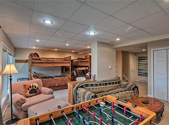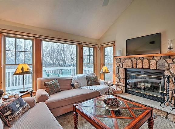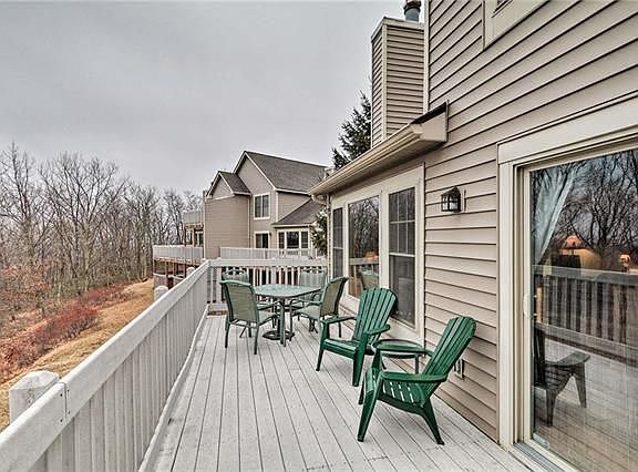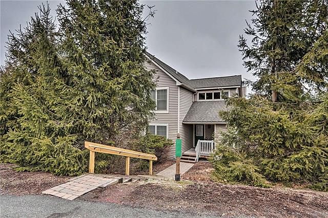 Great 4 bedroom, 3 bath twin home in the amenity-filled association of Northridge Station, adjacent to skiing and the water park at Camelback Resort. An open layout for the living room, dining room and kitchen includes a vaulted ceiling, stone faced wood-burning fireplace and sliders from the dining room to the large deck. The main floor also hosts a bedroom and full bath. The upper level boasts a spacious master bedroom with full bath and 2 closets, as well as a second bedroom with twin beds. The lower level is walk-out and fully finished, with a full bath, laundry area, den space and bedroom set up with two full over full bunk sets accessed by stair steps. Our entrance has been upgraded with pavers in lieu of crushed stone. The huge parking area, unique to this lane, can accommodate guests and visiting family. The HOA provides all firewood and manages the association's heated pool, tennis courts, fitness center, landscaping, snow removal including entrance steps, exterior maintenance except deck and security personnel. Perfect for a primary residence or vacation home. Enjoy all the nearby activities of Camelback Resort, indoor water parks, zip lining, mountain coaster, adventure park, fishing, Pocono Raceway, horseback riding, restaurants, outlet shopping and more. Security system, Central Air, Furniture and furnishings are included. Just bring the fun! We cooperate with buyers' brokers!