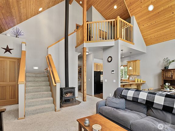 Trail to lake in minutes – Located in a private, park-like setting with a creek and direct trail access to Lake Kachess! This 2 bed, 2.5 bath home backs to Wenatchee National Forest—perfect for hiking, snowmobiling, and ATV adventures right from your door! Soaring ceilings, large windows, and double sliders fill the great room with light. Upstairs, you’ll find the primary ensuite and loft. On the main floor, enjoy a bonus flex space for an office or extra bedroom, plus a cozy woodstove. The lower level offers a separate den or media room. A screened porch doubles as a fun entertaining space, while the drive-through garage provides easy access for all your toys and gear—ideal for full-time living or a weekend getaway!