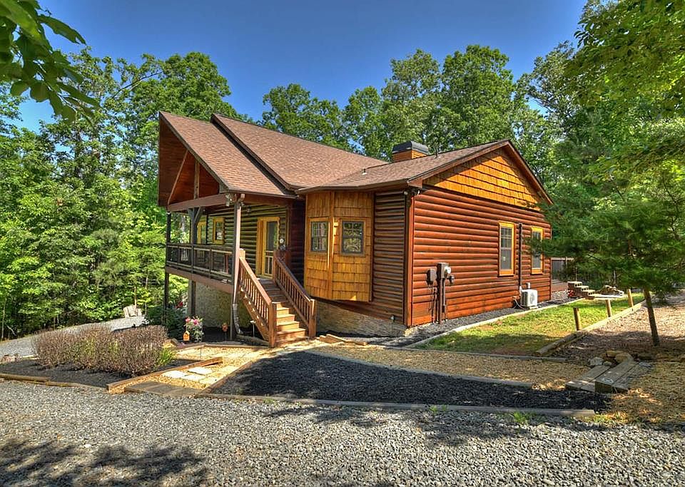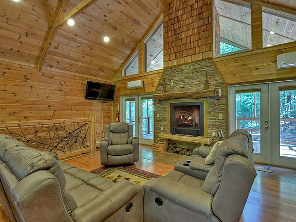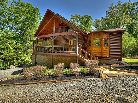 Magnificent Mountain Home, Log Siding , 3 bdrms, 3 bath, plus bonus room in bsmnt. Huge great room w/ cathedral ceilings, tongue and groove wood interior, wood flooring throughout main, stacked stone wood burning fireplace, well-appointed kitchen & new stainless steel appliances, spacious island & separate dining room, large primary bedroom, primary bath boasts a walk in tile shower & jetted tub, finished bsmt w/ 1 bdrm, 1 bath & bonus room, kitchenette & den. All furniture included! Tons of storage, barn doors, screened porch features an outdoor fireplace , great for entertaining, with open deck off screened porch, enjoy the mountain breeze on the covered front porch, large workshop area, new stain, many extras, including 5 mini split units, 2x6 framing, heated flooring in bsmt, located on 1.81 acres in desirable area close to Old Toccoa Farm Golf Course, Toccoa River and shopping .