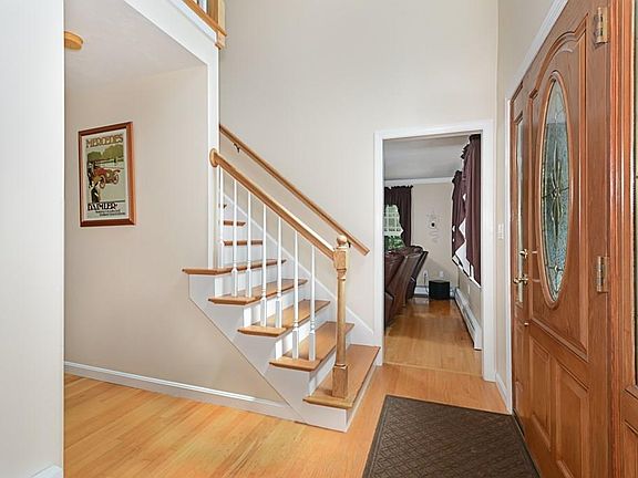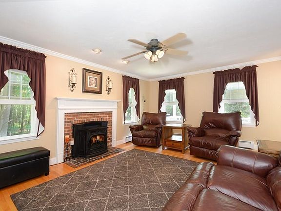 Stunning New England Colonial home with impressive brick entrance leading to a farmer's porch. This home is impeccably maintained and tastefully updated throughout. Step inside to a formal dining room and living room with a harman pellet stove insert. The kitchen features maple cabinets with center corian island. The second floor features 3 spacious bedrooms and a master with a full bath. The family room in the lower level adds an additional 450 square feet of living space. Attached two-car garage with plenty of storage space. There is also additional storage in the outside shed. Enjoy afternoon on the back deck overlooking the mature landscaped, fenced in rear yard. This is special property and one you will enjoy calling home!