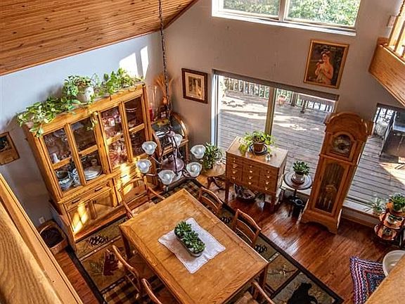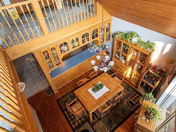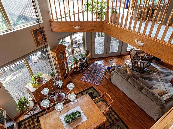 WOW!!! You will be impressed when you walk in the front door of this home. The wall of windows, floor to ceiling stone fireplace, the cat walk, the hardwood floors, it is really hard to take it all in. The little details will also impress you, like the antique butcher block that is built into the kitchen island, tin ceiling feature in the kitchen, the unique antique doors used in the basement and the beautiful bar in the basement. The master bedroom is on the main floor and has a large impressive en suite bath with a walk in closet and 2 closets in the bedroom also. The 1/2 bath on the main floor has a unique vintage toilet and is right next to the laundry room. 2 bedrooms and a bath are on the 2nd floor with a loft area that could be used as an office or play area for the children. Downstairs is a great area for entertaining and has a full bath also. Outside you will enjoy sitting on the large decks, watching the wildlife and fishing on the strip pit. There is also a 30 X 50 outbuilding with part of it insulated and ready to make into a man cave.