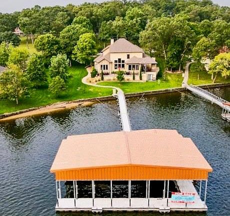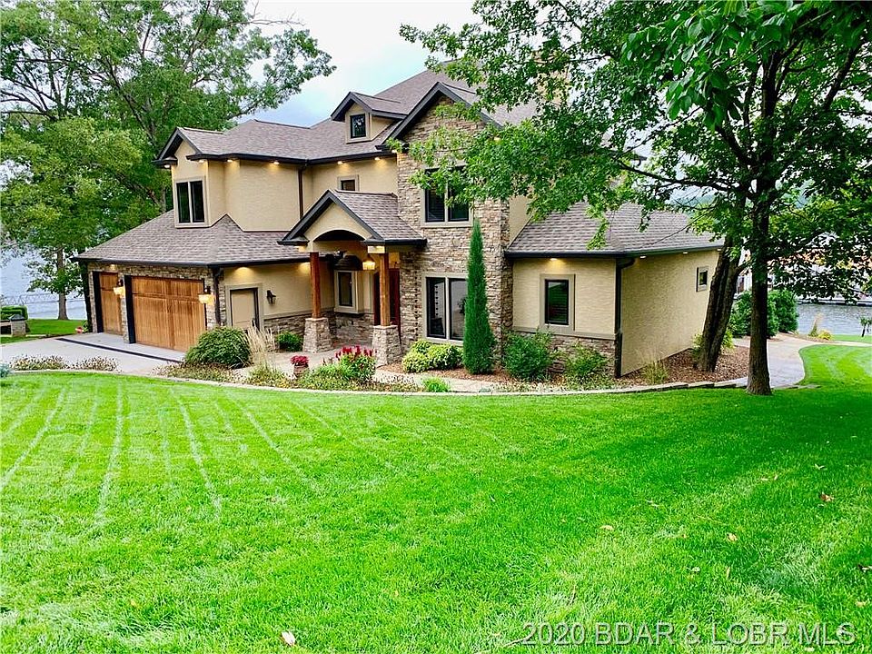 Stunning Luxury Lake front home built on FLAT lot with craftsmanship that is second to none. Situated in a subdivision of homes with distinction, this 4 bedroom 4.5 bath home offers an en suite for every guest room. This home is where comfort and the tiniest attention to details collide. From the moment you walk in the door the curved staircase leave you in awe as it is a work of art. From the study/office that could be a 5th bedroom, the warmth of the open living room and kitchen offer all of the amenities in a space that boasts of all the lake has to offer. Soaring ceilings, customized wood features, floor to ceiling stacked stone fireplace, and views second to none are some of the most memorable features. The covered porch is an outdoor living area that features a custom outdoor fireplace, and a yard that looks like a painting and the dock is the best of the best! 8.3 acres with a work shop can be sold with house for extra money. Inquire of agent for more details.