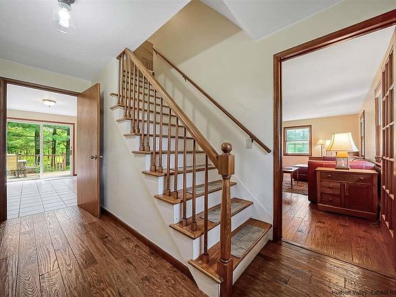 Loaded with charm, this absolutely adorable 4 bedroom, 2 bathroom Cape Cod home is sited on 3.70 acres. Surrounded by beautiful mature trees and landscaping, this property is nestled on a private lot with sprawling rear yard. Spacious and bright, the floor-plan flows beautifully and is ideal for relaxation or entertaining. Ample space for a full-time residence or weekend retreat, Station Road is minutes from the center of New Paltz, the Hamlet of Highland, trails, restaurants, farm stands, shops and all that the Hudson Valley has to offer. Minutes from the NYS thruway, this home is 90-miles from New York City. Enter through the quaint front door into the entry mud-room, which opens to a generous living room with gleaming wood-floors and a beautiful stone surround wood-burning fireplace with a slate hearth. Off of the living room is the formal dining room, which flows into the large open kitchen with brand new appliances, eat-in kitchen area and slider to the amazing rear deck overlooking soaring pine and apple trees. Off of the dining room is a three-season sun-room, which is the perfect place to enjoy dining al fresco, curl up with a book, or just enjoy some sunshine. The main floor also features two bedrooms and a full bathroom with standing shower/tub combo. The second story features a sprawling master suite with ensuite master bathroom. Adjacent to the master suite is the 4th bedroom, presently being utilized as a home-office. The basement is unfinished but is perfect for storage and walks out to the two-car garage with interior and exterior access. A garden and above ground pool are a short walk from the rear deck. House was recently converted to propane with a brand new on-demand propane fired boiler and geothermal hot water heat. Enjoy all the beauty, peace and serenity the Hudson Valley has to offer right here!