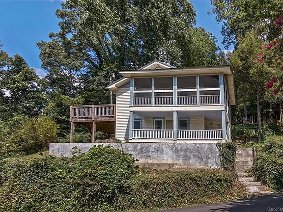 This charming cottage on terraced corner lot features stunning, unobstructed view of Chimney Rock and is a quick stroll to Main Street shops, restaurants, the Rocky Broad River and one mile to Lake Lure Beach! Light and bright kitchen with stainless appliances opens into airy dining and living rooms with access to screened porch and new 14'x14' deck. Downstairs master bedroom complete with ensuite bathroom, ample closet space and access to covered porch and unfinished basement. Extensive upgrades within last 4-5 years include new HVAC system (2019), metal roof, gutter guards, windows, master bedroom ceiling, retaining wall, and upgrades to electrical and plumbing. Enclosed porch used as laundry, mud room and outdoor gear storage. State-maintained frontage road newly paved this summer. With so much at your fingertips, this adorable home would be perfect as a primary residence or vacation home! Check out the 360 tour to see where you'd like to have your next cold drink!