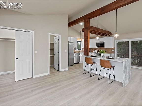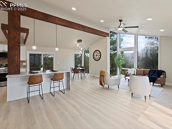 Modern Comfort Backing to Open Space Welcome to a beautifully updated 4-bedroom, 3.5-bath residence with a thoughtful floor plan and high-end finishes, perfectly situated on a quiet .34-acre cul-de-sac lot in West Colorado Springs. Step inside to expansive floor-to-ceiling windows that fill the main level with natural light and frame tranquil views of the open space beyond. The gourmet kitchen features granite countertops and modern finishes, seamlessly connected to open living and dining areas ideal for entertaining. Upstairs, the primary suite offers a true retreat with a spa-like ensuite bathroom showcasing dual showerheads. Directly across the hall sits a dedicated office space—perfect for remote work or as a nursery. Additional bedrooms provide flexibility for family and guests. The finished lower level is designed for relaxation and entertaining, complete with an additional ensuite bedroom, wet bar, and built-in liquor cabinet—an inviting space for movie nights or hosting gatherings. Step outside to the expansive backyard, where open space begins at your fence line—offering unmatched privacy, abundant wildlife, and a sense of retreat. Whether it’s deer wandering by at dawn or quiet evenings on the patio, this home makes every day feel like a mountain getaway. Located within the highly regarded Academy School District, and close to trails, parks, shopping, and dining, this home delivers the perfect balance of modern comfort and natural surroundings.