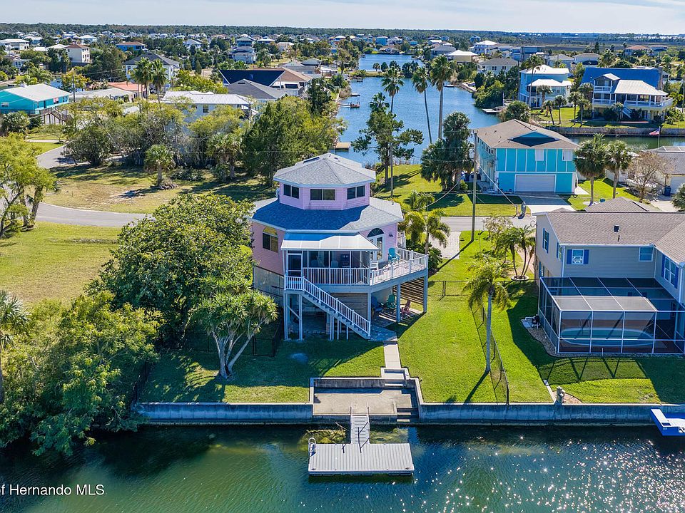 Stunning Pink Three-Story Octagon Home with Preserve & Gulf Views. Welcome to your iconic 3-story octagon dream home, perfectly positioned to capture one-of-a-kind Preserve and Gulf vistas. This turnkey coastal retreat blends character, craftsmanship, and comfort across three beautifully designed levels. On the second story—the heart of the home—you'll find an airy open-concept living space featuring shiplap walls, abundant natural light, and seamless indoor-outdoor flow. The designer kitchen offers gray shaker cabinetry, quartz countertops, a stylish tile backsplash, floating shelves, a farmhouse sink, glass-top cooktop, and a built-in oven with hood vent. This level also includes a spacious guest bedroom, a full bath with a tub/shower combo and glass enclosure, and convenient laundry tucked behind a barn door. Step outside to enjoy coastal breezes from both a balcony and a screened porch overlooking the Preserve. A charming spiral staircase leads to the third level, home to the private primary suite—and the most breathtaking views in the home. Perched high above the surrounding landscape, this level offers panoramic views of the untouched Preserve, shimmering Gulf waters, and sweeping sunsets that light up the horizon. Whether you're waking up to tranquil morning light or unwinding at dusk, the scenery from this top floor is nothing short of spectacular. The suite also includes a generous walk-in closet with custom shelving and a beautifully appointed ensuite bathroom complete with a custom vanity and a walk-in shower with a glass door and niche. Stepping outside, the property truly shines with its 75 feet of waterfront, concrete patio, and floating dock—perfect for embracing the Florida coastal lifestyle. Launch your kayak right from your backyard and explore peaceful mangrove-lined waterways or enjoy a serene paddle through the Preserve. This home puts adventure and relaxation right at your doorstep. The yard is fully fenced with two separate sections, offering added versatility for pets, gardening, or entertaining. A 2021 roof contributes to a low 2,501 per year homeowners insurance cost, and the home is ideally located near the Hernando Beach Boat Lift. Best of all, it's sold fully turnkey with everything included. Hernando Beach is a vibrant waterfront community that offers the best of coastal living—boating, kayaking, paddleboarding, fishing, and more. Just minutes from the world-famous Weeki Wachee Springs, residents also enjoy close proximity to shopping, dining, and hospitals. The community is golf cart friendly and allows short-term rentals with no HOA, no deed restrictions, making it perfect for full-time residents, part-time snowbirds, or investors. The Suncoast Parkway offers easy commuting to Tampa, Brooksville, and beyond. This is your chance to own a piece of paradise with unlimited potential and jaw-dropping views. Your dream waterfront getaway awaits!