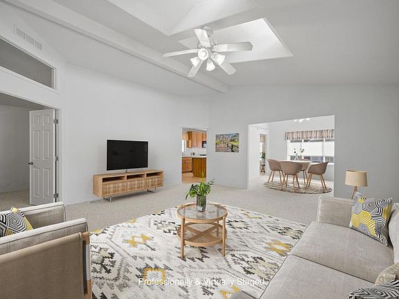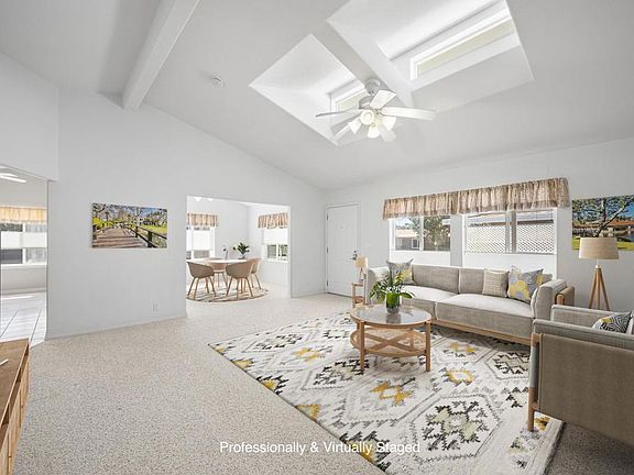 Welcome to Rancho Carlsbad, just 3 miles from Carlsbad State Beach, Ocean Breezes year round, plenty of stylish shopping nearby. 1,638 Square Feet of Interiors plus an attached Full Size Shed complete with electrical and a window, and a two car tandem carport. Built in 2007 and located just over the bridge past the club house amenities and few streets from El Camino Real and Cannon Drive. A full three bedroom house or make it a two bedroom with study that has a double door entry, this home offers a wonderful floor plan (see floor plan with fotos below) and upgraded features including an instant tankless hot water heater with memory sensor, large open upgraded kitchen cabinets with custom slide-out shelving, upgraded water filter in kitchen, nice use of lighting and skylights, vaulted ceilings, dual-pane windows and much more. Price includes refrigerator, and over-sized stackable washer-dryer that is conveniently located in the large master bathroom area. Mud room includes lots of storage and a freezer that goes with the sale. Because this is a newer (than many in park) home all windows are double-pane, and comes with newer style heating and air. Has great curb appeal and can be accessed from the left - front of the home or the right - parking side of the home. Check out the back zone that has four wonderfully thriving citrus trees, and two sheds that go with the sale. One attached shed is approximately 12 x 10 feet, and has a concrete stub wall on back and side. Has window, workbench, and shelving, and electrical for a great hobby room. Extended front porch with metal awnings, Gutters, low maintenance landscaping with Gardner paid through June, Drip Sprinklers, Pest Control contract. Golf Cart available for separate purchase. Recreational Building and Club house just a short walk away. Owners Association fee of $394 includes lots of practical and fun features! Click to community info Here!. This is a land owned community (no land lease), but one person must be 55 or older. Nearby Public Golf Course has a separate reasonable fee depending on desired use. Note:Some photos have professionally and/or virtually staged furniture and decor and are an example of how it could look with this style of furniture.