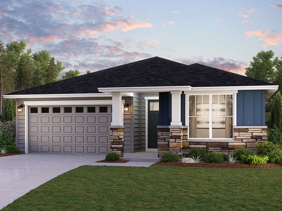 Home Details: Classic Inkwell Exterior Color Scheme (Actual color may differ from rendering) Elevation C 2-Bay Garage Featuring a thoughtfully designed rambler style layout, the Aurora offers ample private and common living space. Toward the front of the home, two generous bedrooms share a full hall bath. A third bedroom-the lavish primary suite-is secluded on the other side of the home and features an en-suite bath and roomy walk-in closet. Additional highlights include a spacious great room that flows into an elegant open dining area.