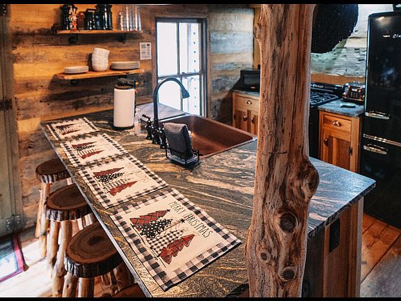 Inside the cabin, enjoy the comfort and amenities you might not be expecting while keeping with the cabin feel. Snuggle up in a plush king size bedroom. The downstairs futon can accommodate two as well. New propane fireplace, large AM/PM bar and a perfect, fully equipped kitchen are waiting for you in this rustic retreat. Wifi is available. There is a downstairs bathroom with an easy access walk in shower.