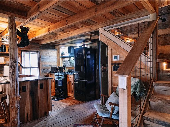 The cabin has been on the rental market since March and shows an impressive income and 5 star reviews. It is turnkey and will come with all furnishing and supplies. This romantic escape is perfect for two, but can accommodate up to 4 guests. Easily accessible with paved roads and oversized parking area. Take in the peace and quiet while you relax on the front porch rockers or cozy up to the fire pit outside and enjoy this wooded natural backdrop. The only hustle and bustle here is that of the horses, deer, groundhogs, and other critters along with the occasional bear.