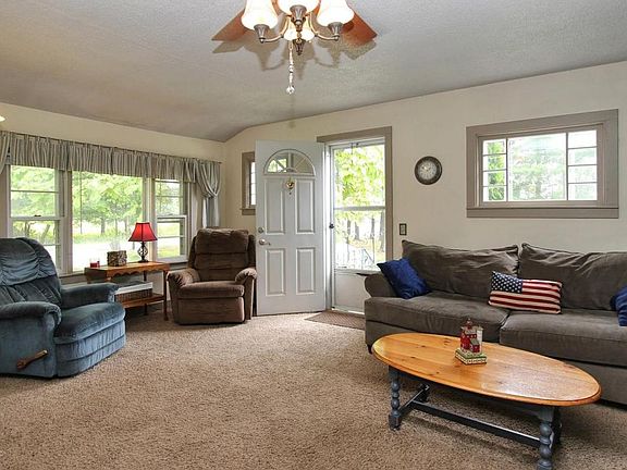 Looking for an affordable place to have horses...well here it is only 5 minutes from highway!! This 3 bedroom 2 bath home sits on over 20 acres with blue gill stocked pond, outdoor arena, automatic waterers, 2 oak, matted 12x12 stalls(room for 3) and hay storage. Three acres are fenced with Ramm fencing into three pastures. All pastures have water, electricity and a 10x14 oak lean to. Arena also has lean to. Big 2+ stall garage with huge loft to store hay or make into a studio. Awesome turkey & deer hunting, trails to ride on and off property. 60 blueberry bushes, strawberry patch, grapes and an apple tree round out this awesome property.